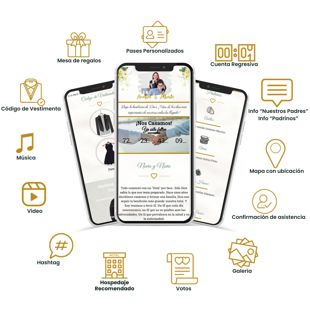 Cuenta con enlaces: a mapas, listas de regalos, hospedaje lo que facilita a tus invitados obtener información adicional y confirmar su asistencia.